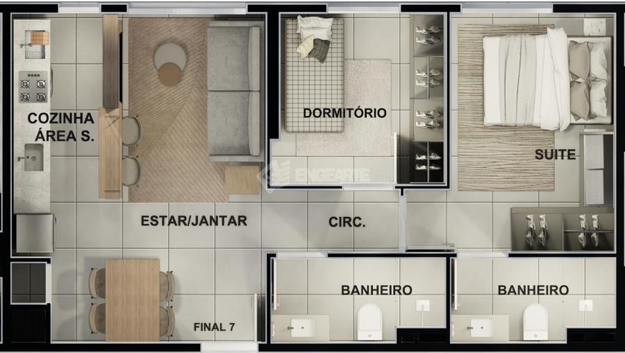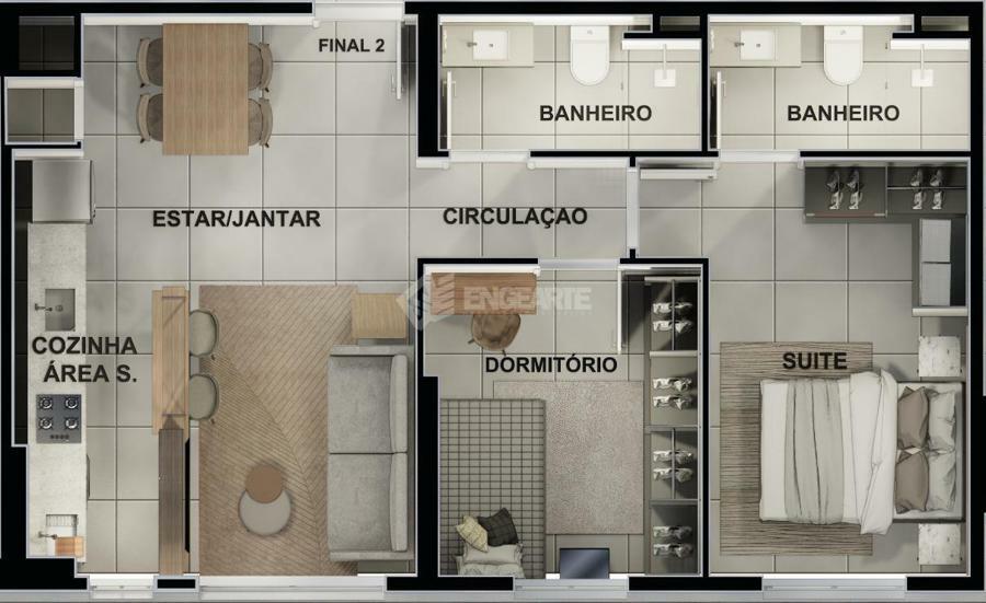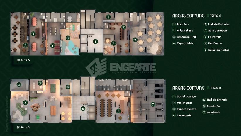 Em apartamentos de dois e três dormitórios (sendo uma suíte), você conta com churrasqueira e vaga de garagem. As plantas, entre 55m² e 74m², são complementadas por um condomínio com mais de 30 opções de lazer, totalizando mais de 5000m² de área.
