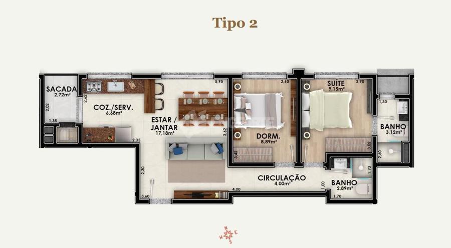 Final Tipo 02 com 67,19 m² Privativos, 02 Dormitórios sendo 01 Suíte