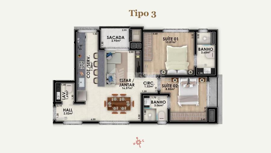 Final Tipo 03 com 70,96 m² Privativos, 02 Dormitórios, sendo 02 Suítes